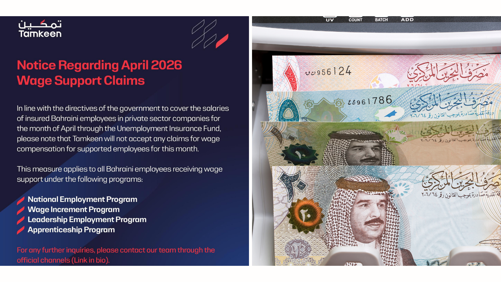 Tamkeen has announced the temporary suspension of all wage support and increment payments for the month of April 2026. This decision follows government directives to cover the salaries of insured Bahrainis in the private sector using the Unemployment Insurance Fund. By streamlining these resources, the government aims to provide direct support to the labor market and ensure economic stability during this period. The suspension applies to all Bahraini employees currently benefiting from Tamkeen’s initiatives, including the National Employment Program and various apprenticeship and leadership schemes. This move is part of a broader legislative effort to utilize the unemployment fund to protect national jobs and maintain the continuity of business activities across the Kingdom. To facilitate this transition, the Social Insurance Organization (SIO) has instructed employers to register through its official website by the deadline of April 28, 2026. While businesses are expected to pay their staff as usual, the SIO will reimburse the establishments by April 30. This coordinated effort between the SIO and the Ministry of Labour reinforces the social protection umbrella for the Bahraini workforce.