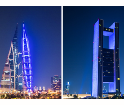 Several landmarks, government buildings, and public facilities across the Kingdom of Bahrain were lit up in blue to mark the National Day and Liberat