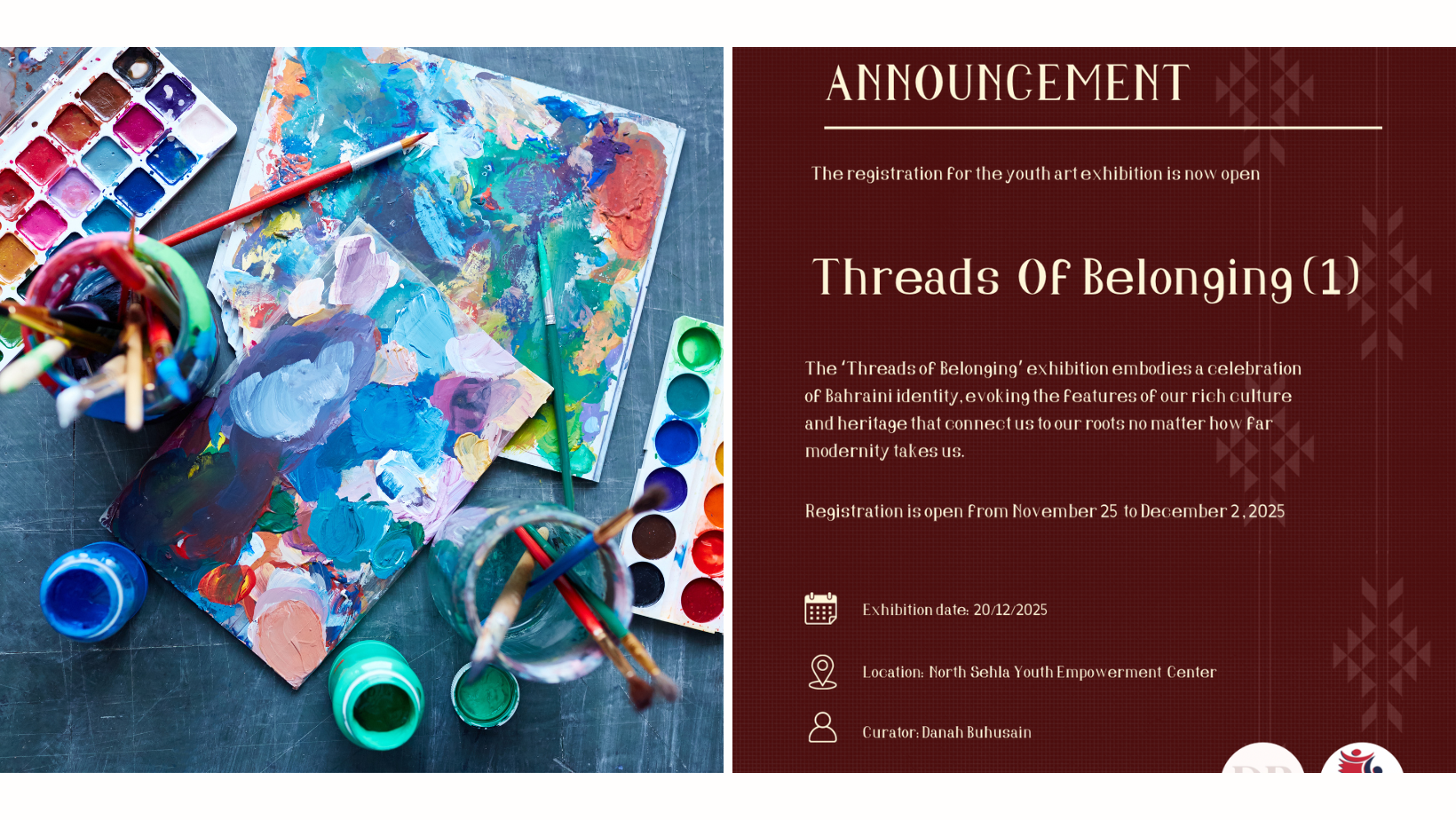 Threads of Belonging 1 is now accepting applications for its upcoming National Day exhibition, celebrating Bahraini identity through themes of belonging, memory, and roots. The exhibition is completely free to join and is open to all artists aged 15–35, offering a great opportunity to showcase creative work on a meaningful national stage. The exhibition will officially open on December 20, 2025, at the North Sehla Youth Empowerment Center, and will be curated by Danah Buhusain.